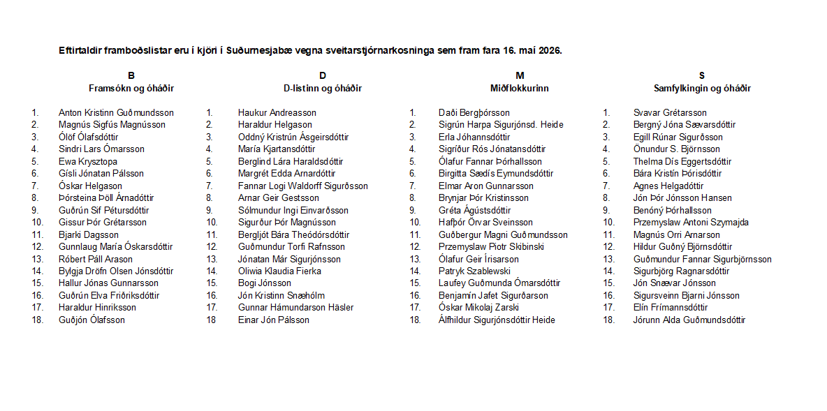 Yfirkjörstjórn Suðurnesjabæjar hefur farið yfir framlagða framboðslista vegna komandi sveitarstjórnarkosninga í samræmi við ákvæði laga um kosningar til sveitarstjórna nr. 112/2021.