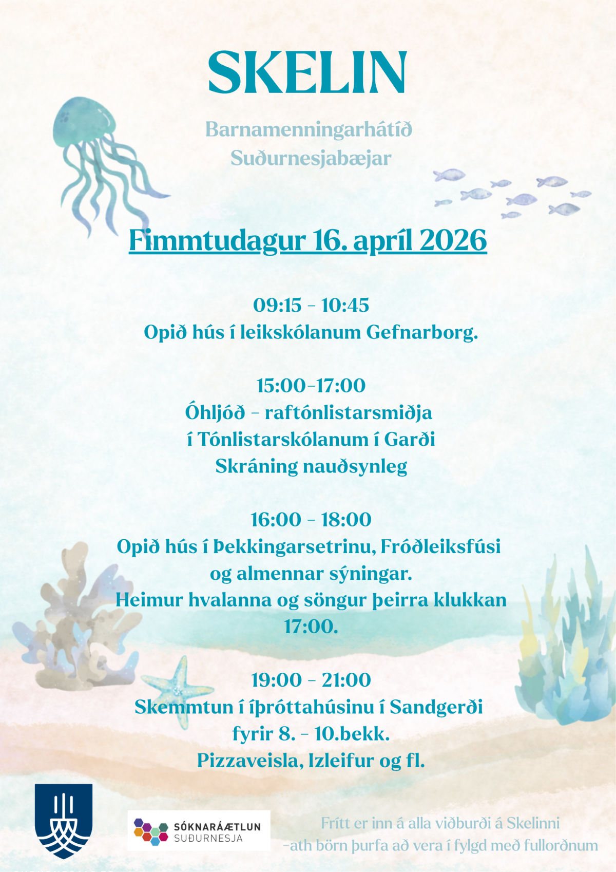 - 15:00-17:00 - Óhljóð - raftónlistarsmiðja fyrir 6.-10.bekk í Tónlistarskólanum í Garði. Skráning nauðsynleg.